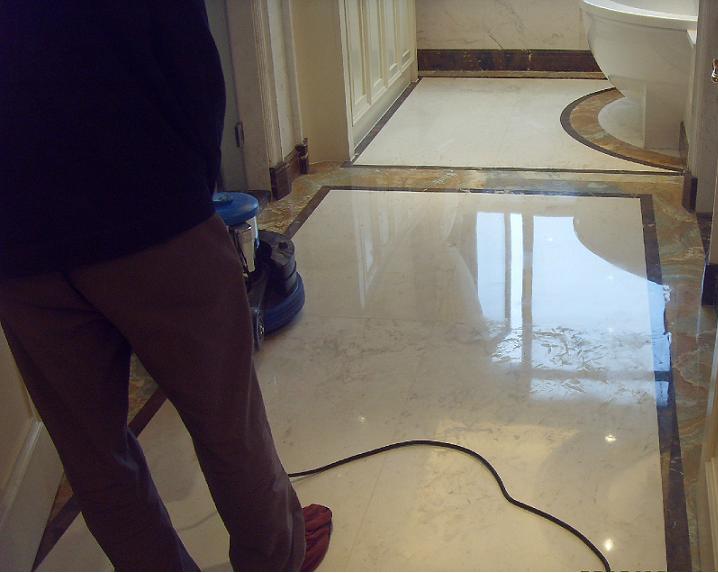 大理石結晶 大理石拋光結晶 大理石翻新打磨 由于大理石具有天然的美麗花紋,廣泛被人們用于酒店、辦公樓的內部裝飾,使其廳堂高雅華貴,但是因為大理石的主要成本是分解石和碳酸鈣,摩式硬度為 4.5 左右,石質較軟,耐酸堿性,抗風化性較差,所以在使用一段時間后,石材表面就會出現孔洞,裂紋及劃痕。這時大理石表面就會失去光澤或發生桔皮現象,使原來高雅華貴的廳堂黯然失色。 一 、石材結晶主要消耗材料 1、主要材料:K1、K2、K3水晶劑。K1藥水是一種石材水晶鏡劑,適用于較深色大理石,K2藥水是一種石材表面加硬劑,用于石材完成面加硬加光,在表面形成保護膜及水晶鏡面。K3采用耐用天然臘樹脂精制而成,能在石材表面上形成高光澤度,能修補石材劃痕,效果持久,同時具有防滑效能。 2、其它材料準備:中性清潔劑、云石膠、清潔水 二、石材結晶主要機械設備和工具打磨機、擦地機、吸水機、多功能洗地機、吹干機、紅色百潔墊、白色拋光墊 、水桶、地拖、小抹子、抹布 三、石材結晶施工條件 1、地面石材鋪貼符合施工規范要求和設計要求。2、石材結晶結晶處理房間進行封閉,防止灰塵、雜物污染地面。 3、石材地面結晶處理機械設備、材料準備齊全,機械設備已經完成試運轉。 4、施工工人有良好的石材地面結晶處理的施工經驗,或者接受過該項施工工藝的培訓合格。 5、墻壁已經完成的施工作業面接近地面處做好成品保護。 四、石材結晶施工操作流程 1、施工程序:石材地面完成面清理 地面干燥處理 地面結晶處理(K2、K3藥水) 整體地面養護處理(K1藥水) 地面清理養護。 2、石材地面完成面清理:進行石材地面結晶處理之前,鋪貼完成面整體平整,無色差,每塊石材之間對角平齊,地面進行整體的清理,用干燥清潔的地拖清理干凈,地面無沙粒、雜質。 3、整體地面養護處理:如果是空隙度大的石材(砂巖、洞石等)要進行大理石防護劑涂刷,12小時后,再用洗地機在地面進行交替完成K2、K3藥水轉磨,即K2-K3-K2-K3-K2共五遍,再換上白色拋光墊,噴上少量的K1藥水,重新拋磨一次,以此增加整個地面的晶面硬度。 4、地面清理養護:當石材表面結成晶體鏡面后,使用吸水機吸掉地面的殘留物,水分,最后使用拋光墊拋光,使整個地面完全干燥,光亮如鏡,如果局部損壞可以進行局部保養,施工完成可以隨時上去行走。 五、 質量標準 (一)保證項目 1.石材的表面平整光滑,完全干燥,光亮如鏡。 2.石材結晶表面抗水性強,并達到產品的硬度要求。 3.要求進行地面石材結晶處理的石材表面已經清潔干凈。 (二)基本項目 1.石材結晶完成面表面潔凈、平整、堅實,光亮光滑,透明色澤一致。 2.石材完成面結晶處理均勻,尤其是靠在建筑物和裝飾物的地面邊緣必須處理到位。 3.石材表面結晶處理所使用的材料符合設計要求,材料必須有產品合格證。 |