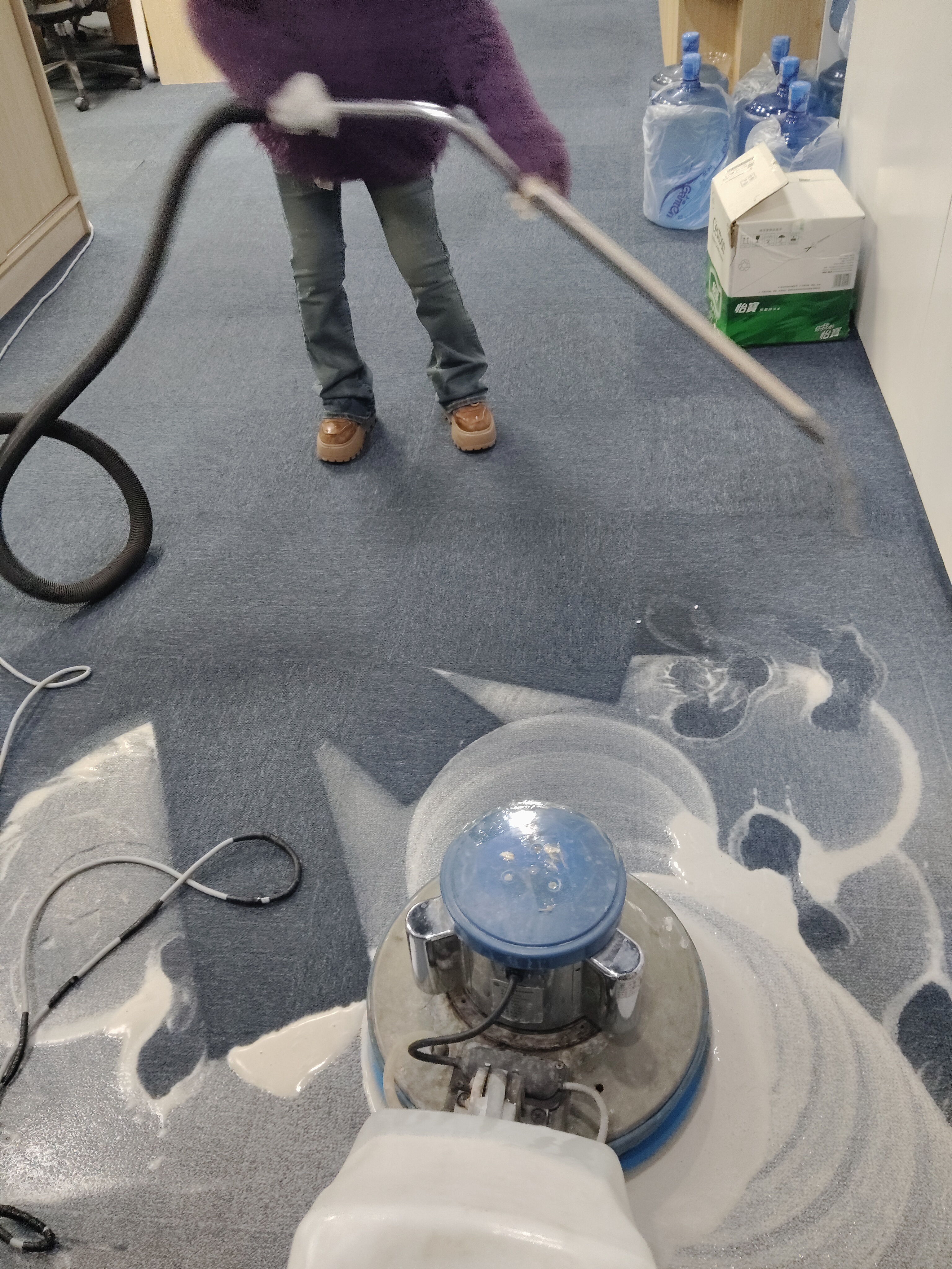 6、清洗地毯的同時,用吸水機吸凈已洗完的地毯,