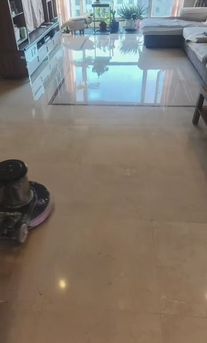 石材表面經過結晶處理后,在日常使用過程中表面晶體會失去光澤。這時只須對石材進行晶面保養就能達到和結晶處理一樣的效果,晶面養護就是用石材結晶粉、翻新漿、晶硬劑、保養劑,在專用結晶設備及鋼絲棉與石材磨擦產生的高溫雙重作用下,通過物化反應,在石材表面進行結晶排列,形成一層清澈、致密、堅硬的保護層,此工藝可使石材色彩更加絢都,延長其使用壽命,突出特點是施工靈活性強、光澤度高、硬度高、使日常護理工作更簡單化,能使石材保持使用狀態和延長使用壽命