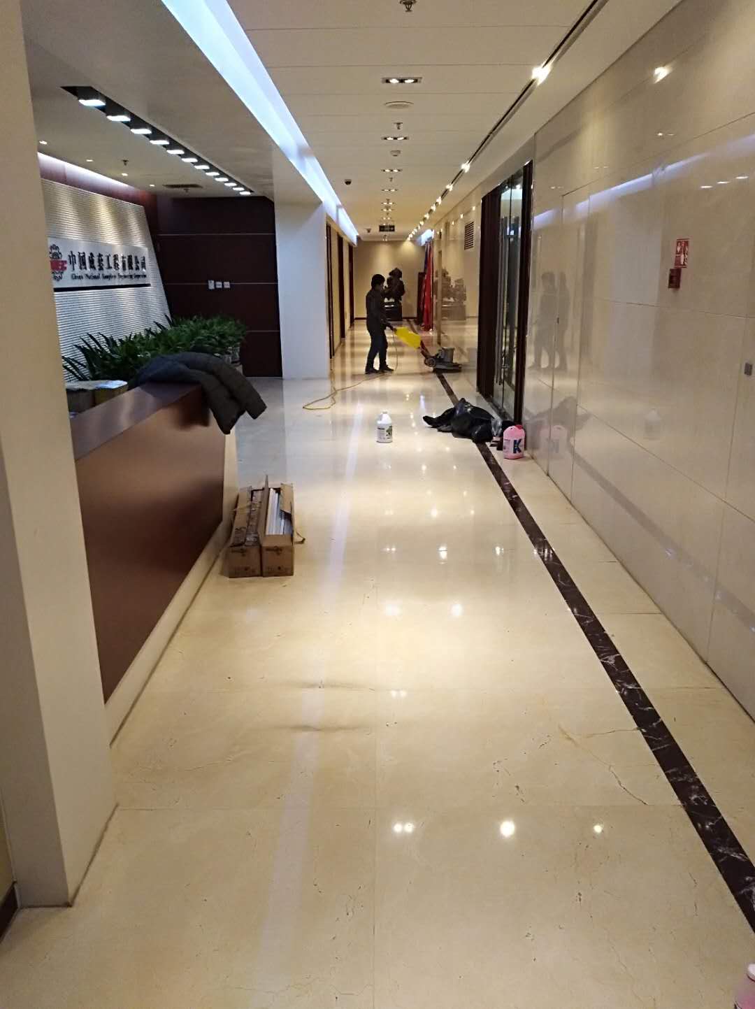 新一代水磨石翻新及結晶處理不再是拋光打臘 水磨石歸屬人造石材,具有密度大,硬度高,耐磨,不生塵,不易剝落等特點。隨著天然裝飾建材業的興起,普通水磨石市場競爭力日趨下減。究起原因是普通水磨石是靠清洗和表面打臘拋光才能獲得短時間內較好的表面效果,其日常清洗打臘工作復雜而難操作,且成本較高,導致人們不愿意經常打臘。 我公司通過實踐總結并學習國處先進的技術,整理出一套選進的水磨石翻新及結晶處理工藝,可使普通水磨石也能和大理石一樣高雅華貴。它適用于舊水磨石和新制成的水磨石表面,大大提高水磨石的商業價值和市場競爭力。 水磨石翻新及結晶處理工藝: 1、利用進口石材翻設備配合翻新磨片將已老化陳舊或病變的水磨石表面,按照磨片的升序由低目到高目依次進行打磨并拋光使其達到理想的亮度。 2、用結晶粉或翻新漿研磨,使其表面結晶硬化,以提高水磨石的耐磨度,再用結晶藥劑進行表面水晶養護。 3、水磨石結晶處理后其表面硬度可達普通麻石硬度,其表面光澤度可達 80 度以上,能保持3到6個月的鏡面效果。 5、日常保養時每月視人流情況做局部保養或季度周期保養,即可長久保持良好的鏡面效果。 6、通過以上工藝處理后的水磨石品質高貴典雅,有天然云石的華貴,又具有花崗石的硬度,而且經濟實惠。
